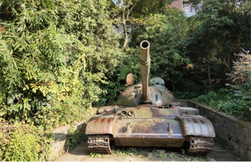 在地下坑道入口左側邊上還有一輛廢棄坦克,據稱這是當年斯大林送給林彪的生日禮物,爬到坦克上方還可以清晰看到坦克內部的結構。