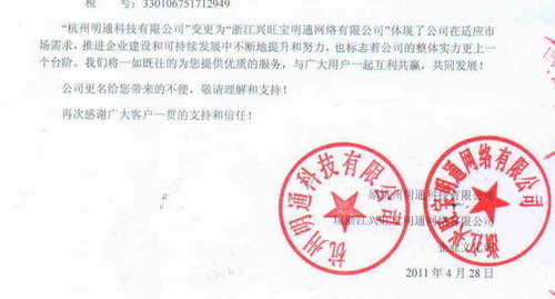 二、自2011年4月28日起,原“杭州明通科技有限公司”旗下網站的業務均變更為“浙江興旺寶明通網絡有限公司”名義簽署合同。